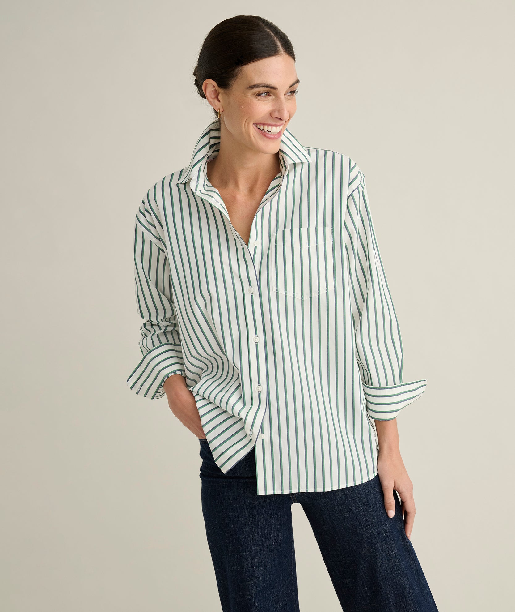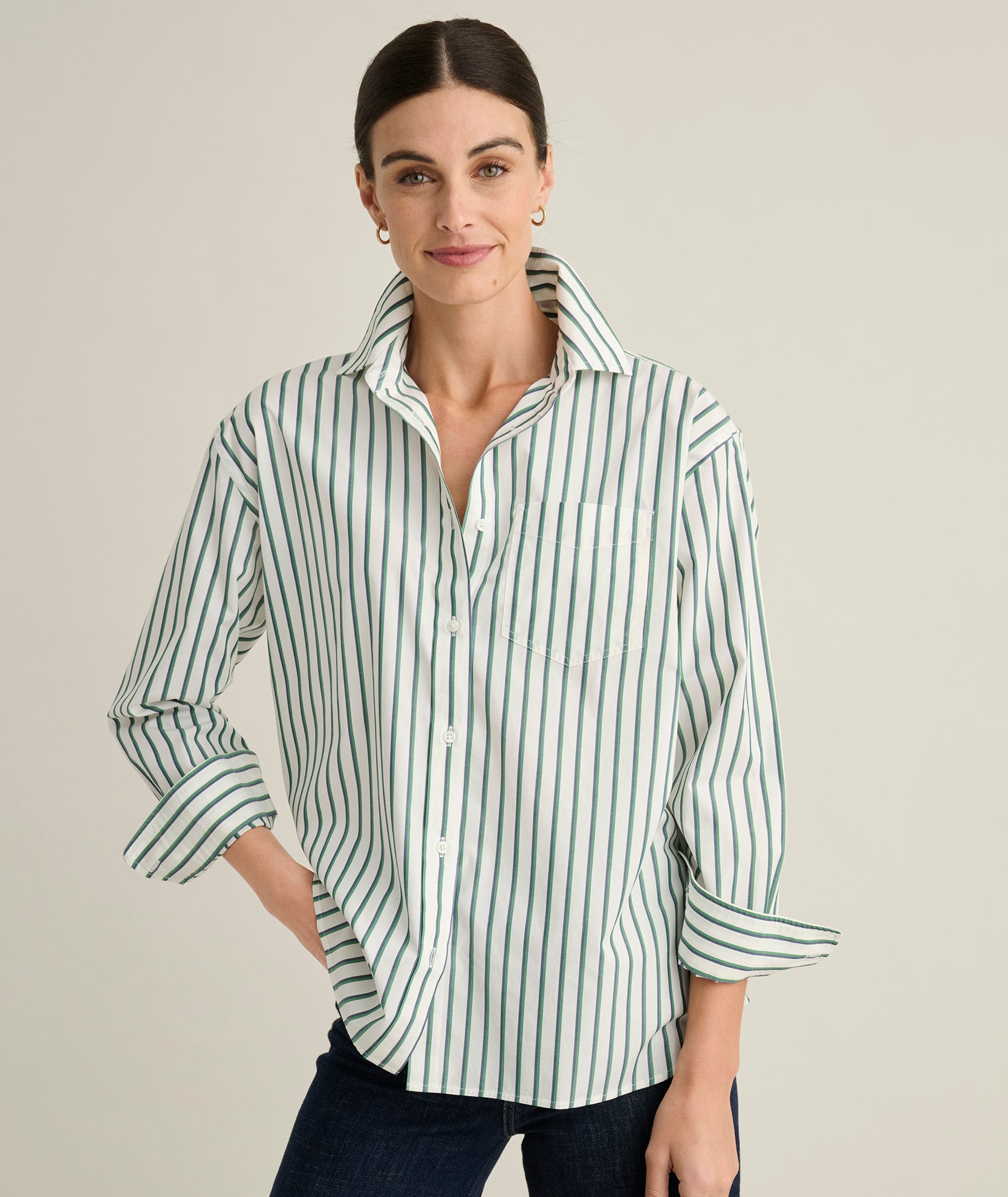It has a soft drape and easy shape to create a laid-back look that still feels refined, while our Perfect Placement Buttons ensure a smooth, gap-free fit in flattering, year-round styles.