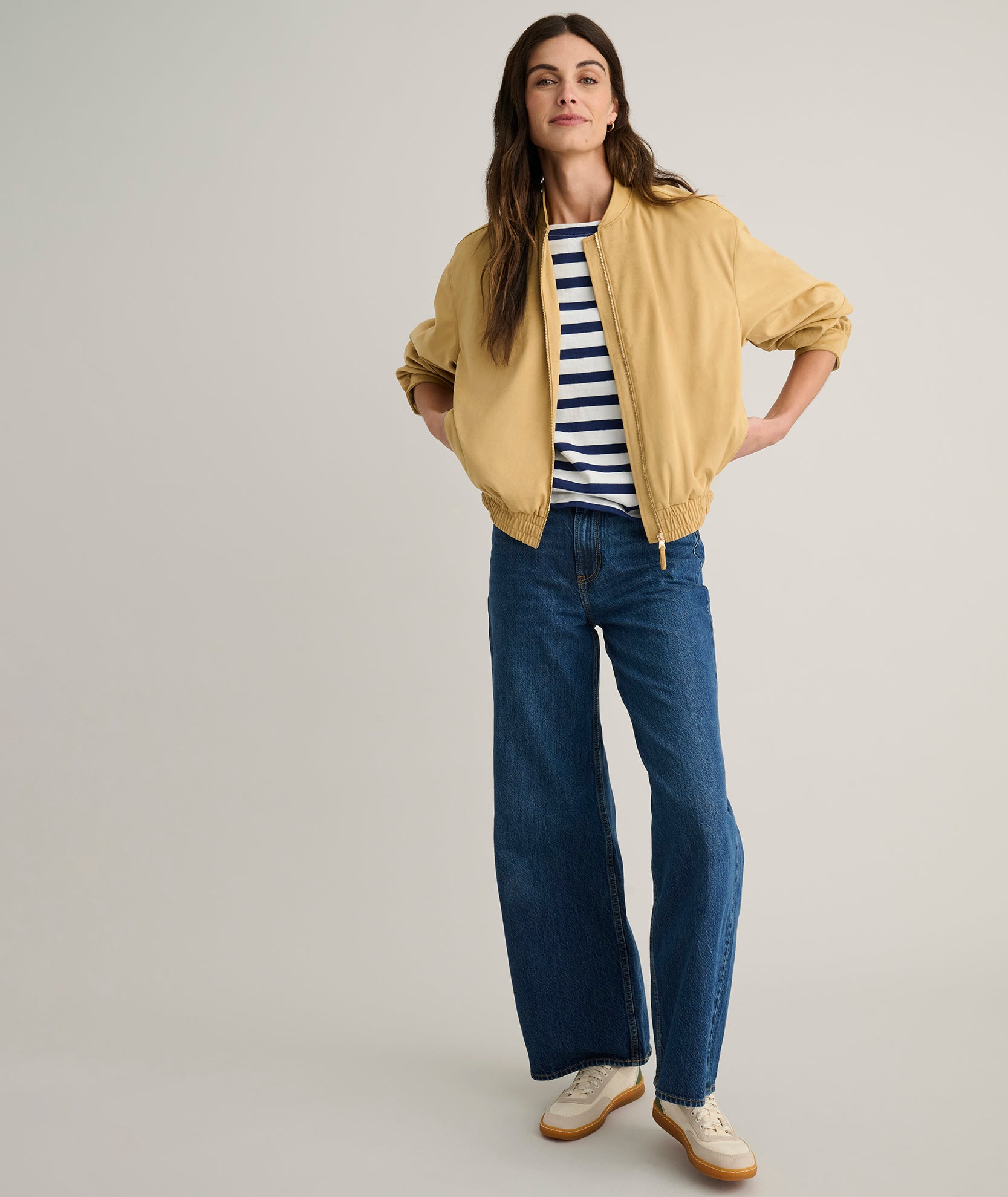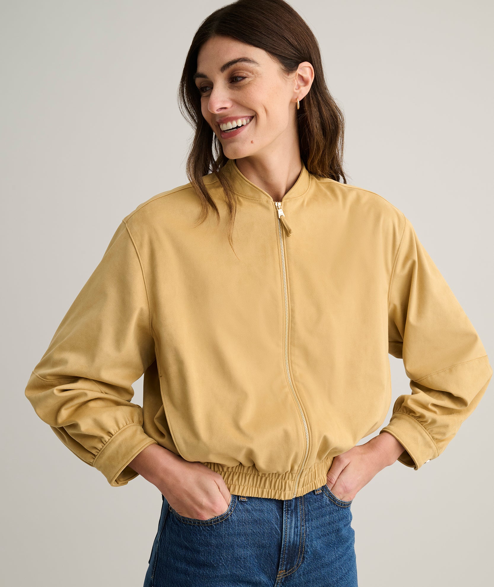 The Zadie Bomber Jacket brings a contemporary edge to classic outerwear. Crafted from soft faux suede with stretch, it offers a comfortable feel and a clean, structured shape. It’s an easy layer that elevates everything from dresses to your favorite tees.